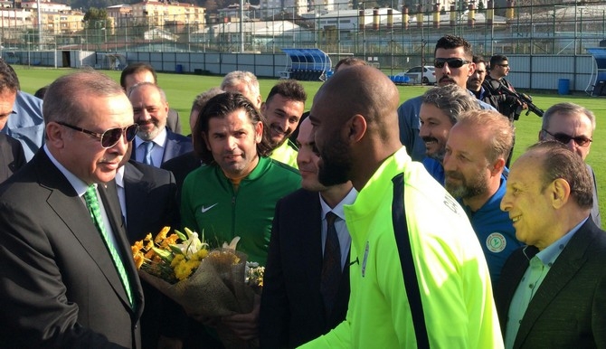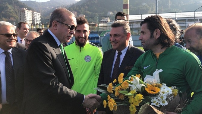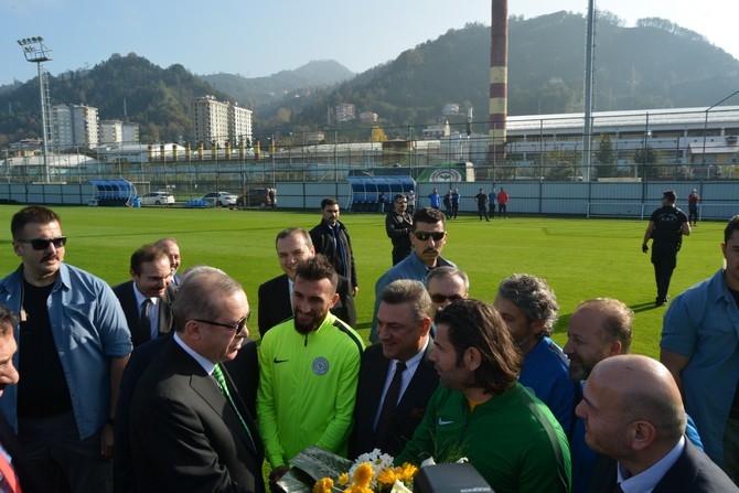 Cumhurbaşkanı Recep Tayyip Erdoğan, çeşitli temaslarda bulunmak üzere geldiği Rize'de Çaykur Rizespor teknik direktörü İbrahim Üzülmez ve futbolcular tarafından çiçeklerle karşılandı.