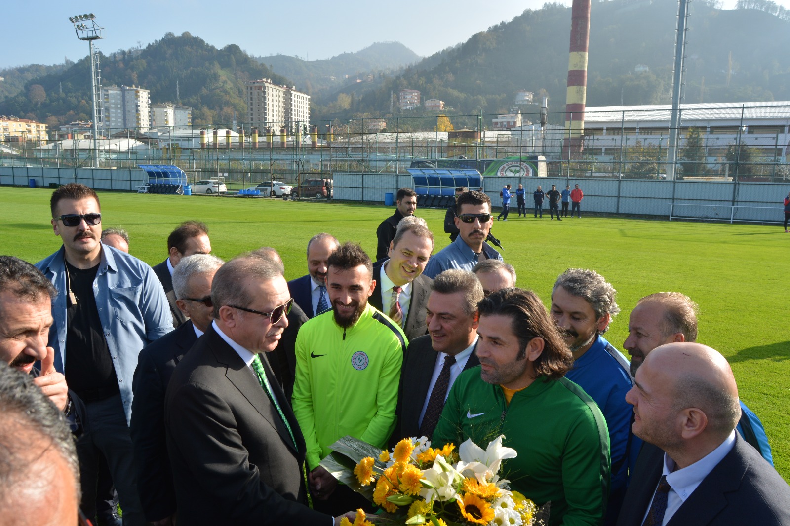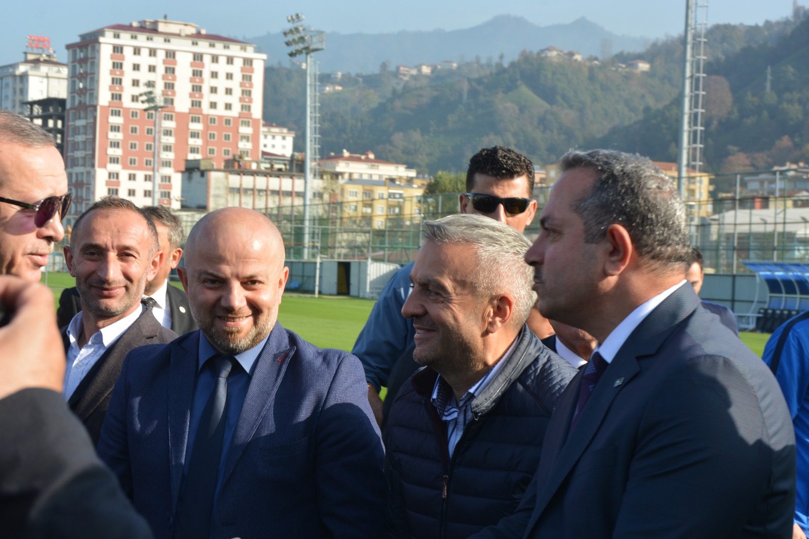 Cumhurbaşkanı Erdoğan'ı burada İçişleri Bakanı Süleyman Soylu, Çaykur Rizespor Kulübü Başkanı Hasan Kemal Yardımcı, Teknik Direktör İbrahim Üzülmez ve takım kaptanı Leonard Kweuke ile Orhan Ovacıklı karşıladı.