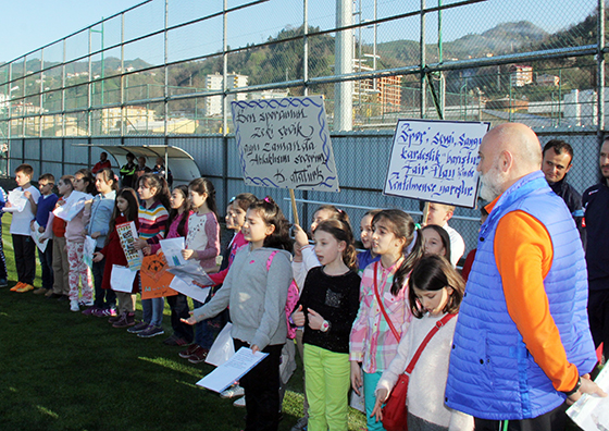 Çaykur Rizespor hafta sonu evinde oynayacağı Beşiktaş maçı hazırlıklarını Çaykur Rizespor Mehmet Cengiz Tesisleri’nde gerçekleştirdiği idmanla sürdürdü. İdman sırasında bugün 56. yaş gününü kutlayan Çaykur Rizespor Teknik Direktörü Hikmet Karaman bir sürpriz ile karşılaştı. Rize Çay İlköğretim Okulu 4-A sınıfı öğrencileri Karaman’a bir doğum günü sürprizi hazırlamıştı. Öğrenciler idman sırasında Karaman’ın sahaya girmesi ile slogan atmaya başlayarak yanlarında getirdikleri, kendi hazırlamış oldukları karaman çizimlerini tecrübeli teknik adama hediye ettiler. Öğrenciler Karaman için yazdıkları şiirleri de okudu. Ayrıca her bir ağızdan Çanakkale Zaferi konulu bir de şiir okundu. Öğrenciler yaptıkları konuşmalarda sporda kardeşliğin önemine dikkat çektiler. Öğrenciler futbolcular için hazırladıkları çizimleri de futbolculara hediye etti.