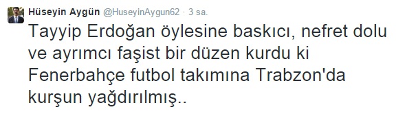 CHP Tunceli Milletvekili Hüseyin Aygün, Fenerbahçe takım otobüsünün Rize deplasmanı dönüşünde uğradığı silahlı saldırı sonrası sosyal paylaşım sitesi Twitter'dan tepki çeken bir mesaj paylaştı.