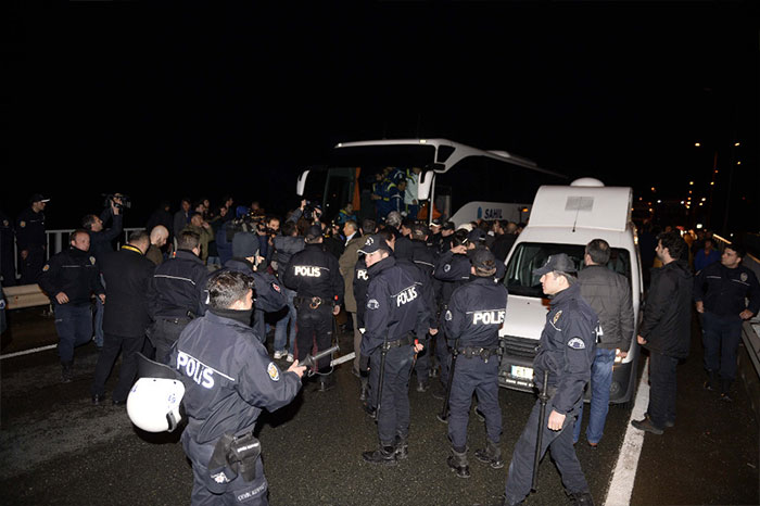Fenerbahçe kafilesi saldırının düzenlendiği otobüsten indirildi, Trabzon Havaalanı'na zırhlı polis aracı ile gidiyor.