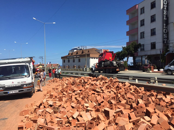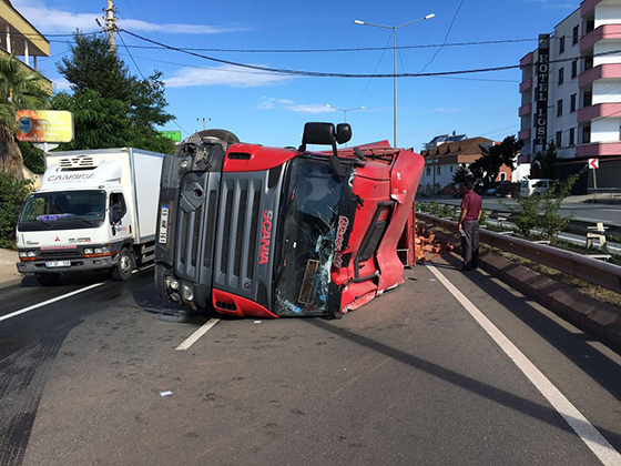 Trabzon'un Arsin ilçesinde tuğla yüklü TIR'ın yola devrilmesi sonucu Karadeniz Sahil Yolu'nda ulaşım adeta durdu.
