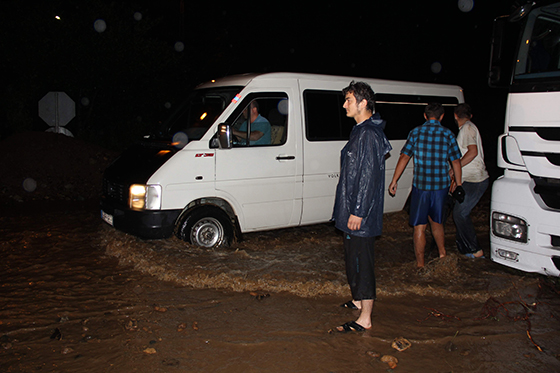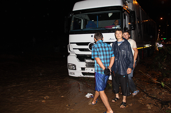 Edinilen bilgiye göre, Trabzon’un Of ilçesi Hayrat Yol ayrımı mevkiinde şiddetli yağışlar nedeniyle yamaçtan sel sularının getirdiği odun kütleleri ve balçık, saat 20.30 sıralarında Karadeniz Sahil Yolu’nun Trabzon-Rize istikametini araç ulaşımına kapadı. Yolda mahsur kalan araçlar olurken, bir TIR çamura saplandı. Çamura saplanan TIR nedeniyle ulaşım dururken, iş makinelerinin yardımı ile TIR saplandığı balçıktan kurtarıldı. kurtarıldı. Yolda temizleme çalışmaları devam ederken, ulaşım Rize-Trabzon karayolundan tek şeritten kontrollü olarak veriliyor.