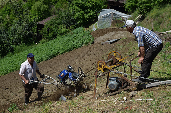 İki arkadaş inşaat çekme makarasına bağladıkları pat pat'tan bozma çapalama makinesi ile ayakta bile durmakta zorluk çekilen yüzde 70 eğimli arazide tarım yapıyor. Kendi yaptıkları çapalama makinesini ise Ford kamyonet şanzımanı ve dinamodan yaptıkları düzenekle çalıştıran iki kafadar daha önce 3 günde çapaladıkları arazilerini böylece 2 saatte çapalayabiliyor.