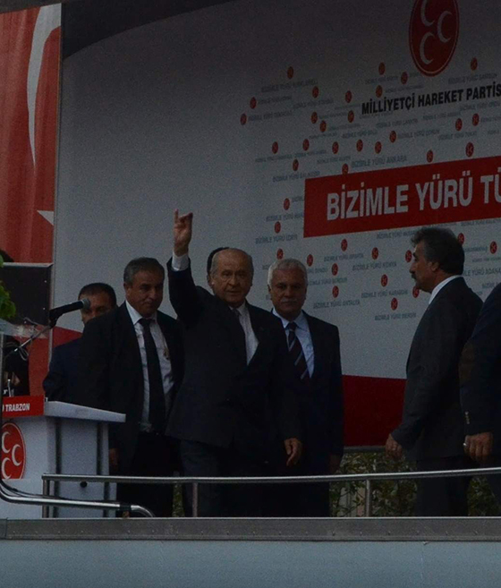 Giresun ve Rize mitinginin ardından Trabzon Atatürk Alanı’nda Trabzonlulara hitap eden Bahçeli konuşmasına “Trabzon’da, bu muhteşem tabloyla karşılaşmaktan son derece bahtiyarım. Bugün Karadeniz hakikaten çırpınıyor, göğsümüzü kabartıyor. Trabzon adeta deniz gibi dalgalanıyor, sevdalısına kucak açıyor” diyerek başladı.