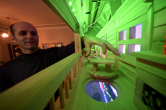 "Kağıda şeklini çizdiğim evin yapımı bir hafta sürdü. Sanayiden aldığım çam ağacı parçalarını evimin salonunda toplayarak el işçiliği sayesinde şekillendirdim. Akvaryumun daha kullanışlı olması için alt bölümüne raf ve dolaplar ekledim. Üst bölümünde ise ahşap evi yaptım ve ışıklandırdım ancak fazla detaycı olduğum için evin ön bölümüne oturma alanları, şömine ve masalar ekledim. Ayrıca balıklara yem verebilmek için ev önündeki dekor olan masanın kaldırılması gerekiyor."