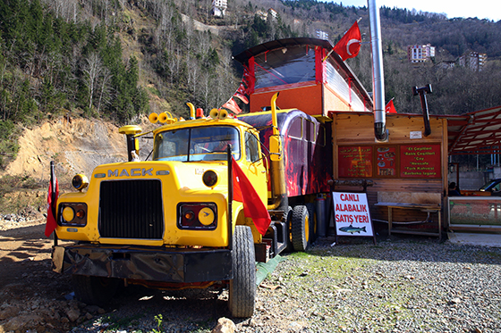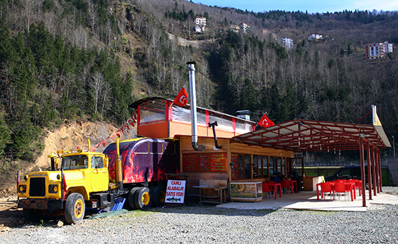 Trabzon'da dünyaca ünlü turizm merkezi Uzungöl'e ulaşımın sağlandığı karayolu kenarında satın aldıkları tırı restorana çeviren 2 işletmeci, yer sıkıntısı çekmemek için tır dorsesinin üzerine ahşap ve demirden kat çıktı.