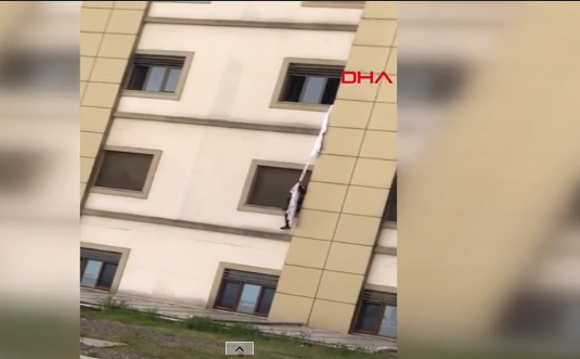 Öte yandan, yabancı uyruklu kişinin, hastaneden kaçmaya teşebbüs ettiği anları, çevredeki poliklinikte tedavi gören hasta yakınları, cep telefonu kamerasına kaydetti. Görüntülerde; yabancı uyruklu kişinin, hastanenin 3'üncü kat penceresinden, birbirine bağlayıp, aşağıya sarkıttığı çarşafla zemine inmeye çalıştığı, 1'inci katta mahsur kalınca da, çevredekilerin Beyendi, ne yapmaya çalışıyorsunuz. Düşeceksiniz diyerek uyarılarda bulunduğu duyuluyor.