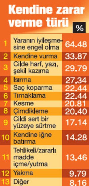 “Kendine zarar verme ve nedenleri” başlıklı araştırmada öğrencilerden 245’inin yani yaklaşık yüzde 36’sının çeşitli nedenlerle kendilerine zarar verdikleri ortaya çıktı.