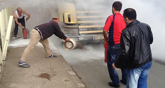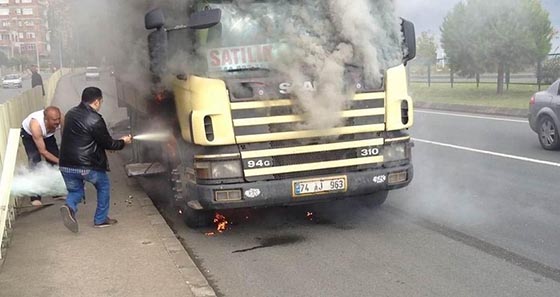 Olay, Trabzon’un Kavaklı beldesi Yalı Mahallesi’nde meydana geldi. Edinilen bilgilere göre, Necati Hacıoğlu (50) idaresindeki 74 AJ 963 çekici plakalı TIR, Rize’ye meyve suyu ve temizlik malzemesi götürürken, yolda bir anda alev aldı. Hacıoğlu, aracı güçlükle yol kenarına çekerken, Kavaklı beldesi esnafları ve çevredeki dolmuş şoförleri ellerinde yangın tüpleri ve kovalar ile yanan araca müdahale etmeye çalıştı.
