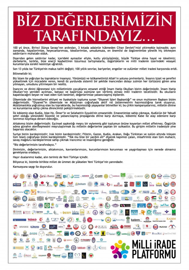 Milli İrade Platformu'nun "Biz değerlerimizin tarafındayız" başlığında verdiği ilan, 16 gazetede yayınladı.