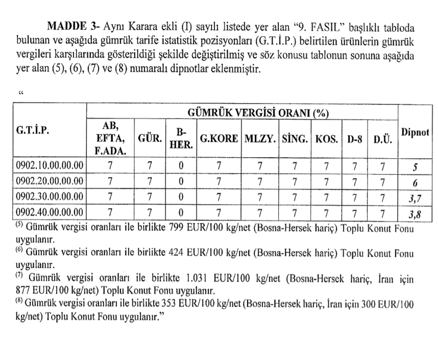 Buna göre; yeşil çay ithalatında 799 EUR/100 kg/net ile 424 EUR/100 kg/net Toplu Konut Fonu alınacakken siyah çay ithalatında ise 1.031 EUR/100 kg/net ile 353 EUR/100 kg/net Toplu Konut Fonu alınacak.