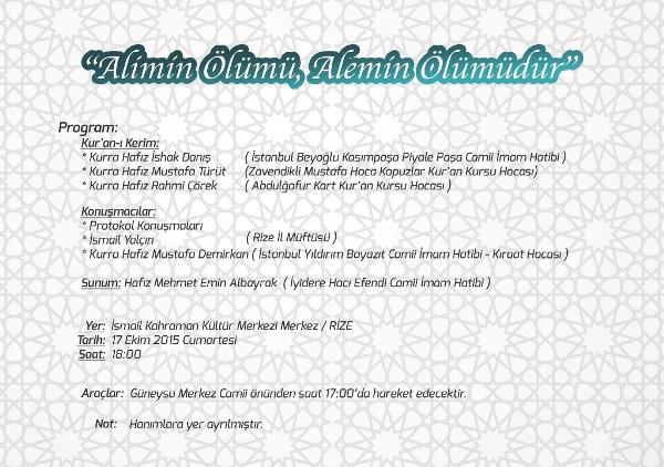 Rize Belediyesi, İrşad Vakfı ve Rize İl Müftülüğü’nün katkılarıyla düzenlenecek olan program İsmail Kahraman Kültür Merkezinde 17 Ekim 2015 Cumartesi saat: 18.00’da gerçekleştirilecek.