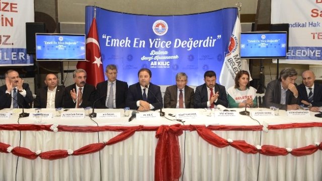 Kılıç’tan sonra söz alan Belediye-İş Sendikası Genel Başkanı Nihat Yurdakul, taşeron işçiliğe getirilen düzenlemeyi eleştirip, işçilerin demokratik haklarını aramasının önemine dikkat çekerken CHP Genel Başkan Yardımcısı Veli Ağbaba da bir konuşma yaparak, “Türkiye’de kutuplaşma bu kadar yoğun yaşanırken dil, din, ırk ve mezhep ayrımı gözetmeksizin yapılan bu toplu sözleşmeyi çok önemsiyor ve belediyecilik tarihi açısından bir ilk olarak görüyorum. Ortadoğu’daki ülkelerin nasıl can çekiştiğini gördükçe, bize unutturulmaya çalışılan 29 Ekim’in bu sözleşmede geçmesinden onur duyuyor, bu sözleşmeyi hazırlayanlara teşekkür ediyorum” diye konuştu. Konuşmalar sonrası taraflar sözleşme metnine imza atıp, işçileri selamladılar. İmza töreninden sonra katılımcılara, Maltepeli kadınlar tarafından Süreyyapaşa Cam Atölyesi’nde hazırlanan işlemeli tabaklar ve çiçek takdim edildi.