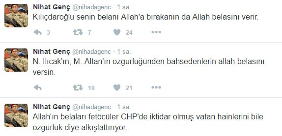 “Allah'ın belaları fetöcüler CHP'de iktidar olmuş vatan hainlerini bile özgürlük diye alkışlattırıyor. N. Ilıcak'ın, M. Altan'ın özgürlüğünden bahsedenlerin Allah belasını versin. Kılıçdaroğlu senin belanı Allah'a bırakanın da Allah belasını verir.”