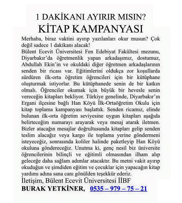 Diyarbakır'ın Ergani ilçesine bağlı Han Köyü İlk-Orta Öğretim okuluna naçizane bir kütüphane yapma kararı aldık. Köy okulunda ki öğretmenimiz Abdullah Ekin ve arkadaşlarının talebi üzerine bir kampanya başlattık. Sosyal medya ve Zonguldak ilinde şuan hızla yayılmaktayız. İnsanlar ile bire bir görüşüyor, detaylı olarak kampanya hakkında bilgi aktarıyoruz. Abdullah Ekin öğretmenimiz Diyarbakır köy okullarında ki kütüphane hazırlıklarını bizzat sürdürüyor. Diyarbakır'da ki kitap ihtiyacı olan bütün köy okullarına kütüphane açmak istiyoruz. Kitaplar şuan Zonguldak, (Bahçelievler Mahallesi, Gelincik Sokak. Furkan Apt. No:24 Daire:4 Zonguldak, Merkez.) adresine kargolanmaktadır. Bizler Mart ayına doğru kitapları kendi elimizle nakliye desteğini belediye, valilik vs. ayarlayıp Diyarbakır'a götüreceğiz. Kampanyamızda belirttiğimiz üzere ilk-orta öğretime uygun kitapları ve kırtasiye gereçlerini topluyoruz. Ayrıca bunun yanı sıra boyama kitapları ve boya kalemleri de talep ediyoruz. Şuan yaklaşık 230 kişi (6 gün içerisinde) dönüş sağladı ve kitap sözü aldık. Umarım çok daha fazla insana ulaşır, eğitim adına daha iyi şeyler yapabiliriz.