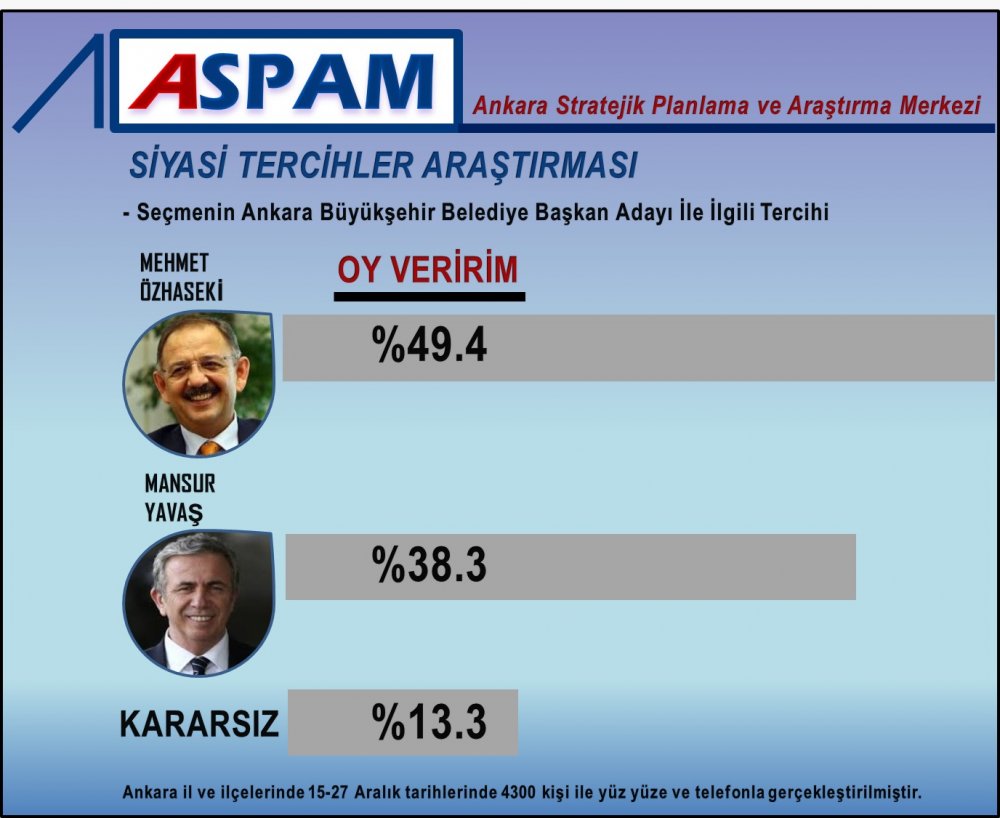 Mehmet Özhaseki %49,4 oy oranına sahipken , Mansur Yavaş’ın %38.3 oranında oy alacağı tahmin ediliyor. Karasız seçmen oranı ise %13.3