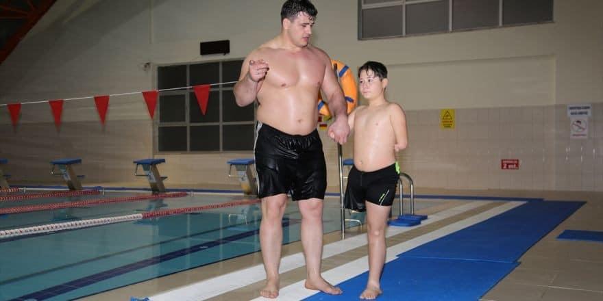 Olimpiyat ikincisi, dünya ve Avrupa şampiyonu milli güreşçi Rıza Kayaalp, Yozgat'ta doğuştan elleri ve bir bacağı olmayan, doktor tavsiyesiyle tanıştığı yüzmede milli takım seçmelerine katılma başarısı gösteren 11 yaşındaki Muhammet Enes Sarı'yı ziyaret ederek, birlikte yüzdü.