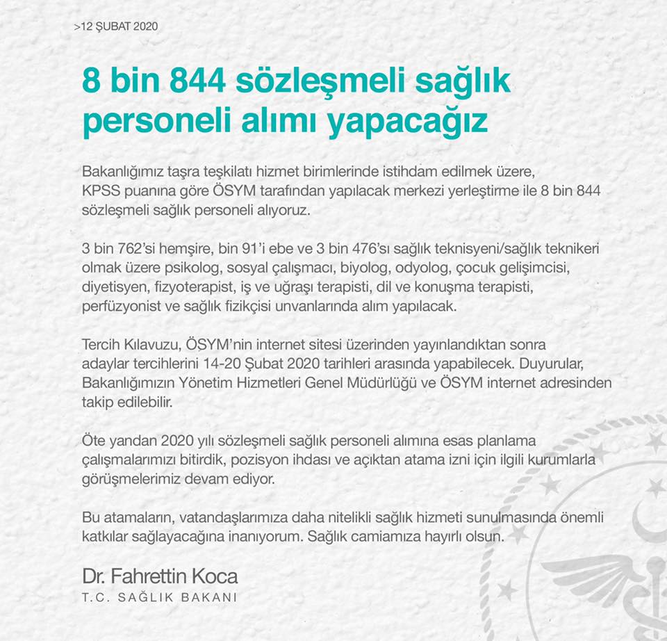 Bakanlık bünyesinde taşra teşkilatı birimlerinde istihdam edilmek üzere KPSS puanına göre ÖSYM tarafından yapılacak merkezi yerleştirme ile 8844 sözleşmeli sağlık personeli alacak..