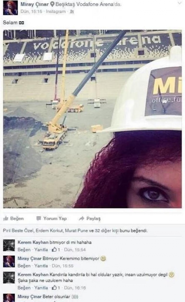 Vodafone Arena'nın koltuklarını yapan firmada çalıştığı belirtilen Miray Çınar adlı kadın personel, statta bir selfie çekti ve paylaştı. Bir arkadaşından gelen soru üzerine inşaat hakkında bilgi veren Çınar, stadın belirlenen tarihte bitmeyeceğini yazdı ve buna sevindiğini ifade etti.