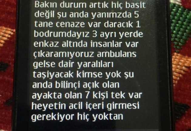 Sur’da bulunan bir teröristin cep telefonuyla HDP’li bir milletvekiline gönderdiği kısa mesaj dikkat çekti. Mesajda, "Bakın durum artık hiç basit değil, şu an yanımızda 5 tane cenaze var, daracık bir bodrumdayız. 3 ayrı yerde enkaz altında insanlar var. Çıkaramıyoruz. Ambulans gelse dahi yaralıları taşıyacak, bilinci açık olan kimse yok şuan. Bilinci açık olan 7 kişi var sadece. Heyetin acilen içeri girmesi gerekiyor" ifadeleri yer alıyor.