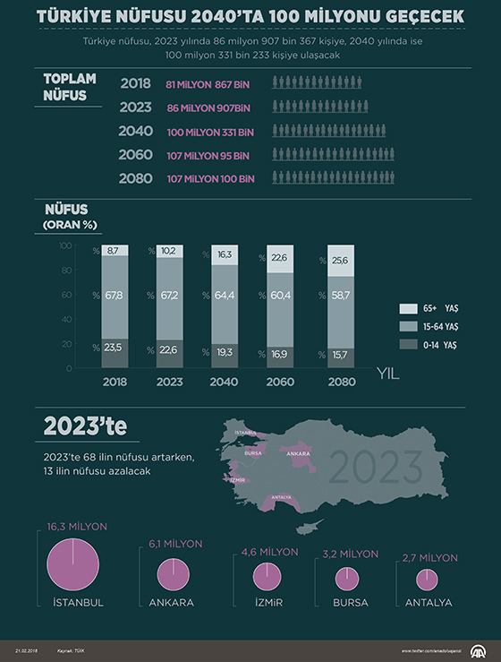 Türkiye nüfusu, 2023 yılında 86 milyon 907 bin 367 kişiye, 2040 yılında ise 100 milyon 331 bin 233 kişiye ulaşacak. 2069 yılına kadar artarak 107 milyon 664 bin 79 kişiyle en yüksek değerini elde edecek ülke nüfusu, bu yıldan itibaren azalışa geçerek 2080 yılında 107 milyon 100 bin 904 kişi olacak. İstanbul nüfusu, 2023 yılında 16,3 milyona ulaşacak