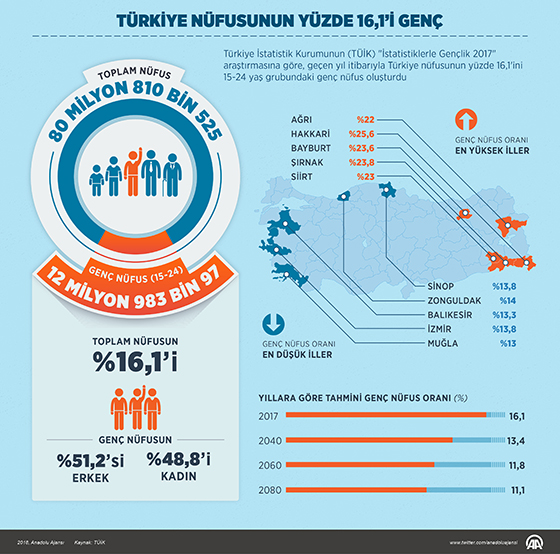 Türkiye İstatistik Kurumunun (TÜİK) "İstatistiklerle Gençlik 2017" araştırmasına göre, geçen yıl itibarıyla Türkiye nüfusunun yüzde 16,1'ini 15-24 yaş grubundaki genç nüfus oluşturdu.