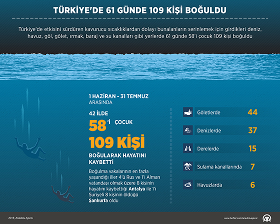 Türkiye'de etkisini sürdüren kavurucu sıcaklıklardan dolayı bunalanların serinlemek için girdikleri deniz, havuz, göl, gölet, ırmak, baraj ve su kanalları gibi yerlerde 61 günde 58'i çocuk 109 kişi boğuldu.