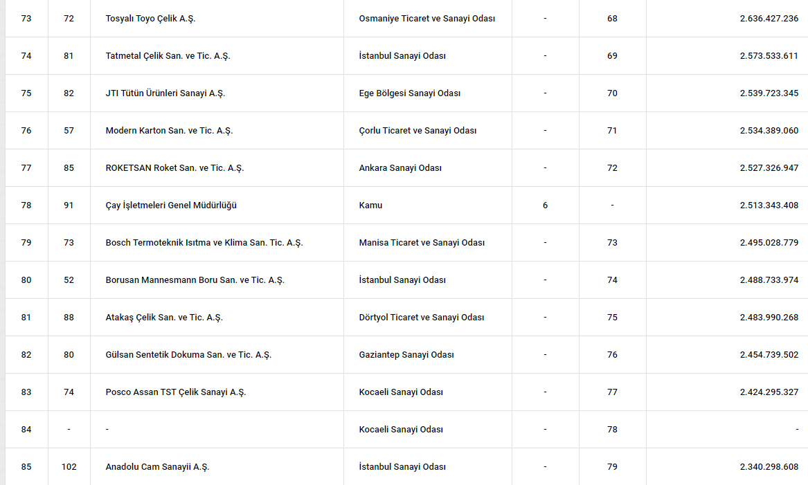 Türkiye Petrol Rafinerileri AŞ (TÜPRAŞ), üretimden satışlarda 87 milyar 949 milyon lirayla listede ilk sırayı alırken, Ford 37 milyar 71 milyon lirayla ikinci, Toyota ise 25 milyar 851 milyon lirayla üçüncü oldu. Oyak Renault da 24 milyar 635 milyon lira üretimden satışla dördüncü oldu. Böylece ilk dört şirket, 2019 yılında bir önceki senenin sıralamasına göre değişmedi.