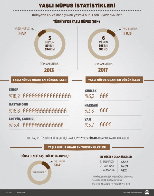 Buna göre, 2013 yılında 5 milyon 891 bin 694 kişi olan yaşlı nüfus, son 5 yılda yüzde 17 artış göstererek geçen yıl 6 milyon 895 bin 385 kişi oldu. Yaşlı nüfusun toplam nüfus içindeki oranı 2013 yılında yüzde 7,7 iken, geçen yıl yüzde 8,5'e yükseldi. Yaşlı nüfusun yüzde 44'ünü erkek, yüzde 56'sını kadın nüfus oluşturdu.