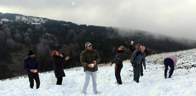 Kar yağmamasına rağmen Uludağ’da 50 santim kalınlığında kar gören vatandaşlar, kar topu oynamayı ihmal etmedi.