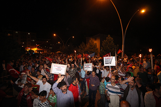 ETÖ tarafından yapılan darbe girişiminin ardından düzenlenen demokrasi nöbetleri 13’üncü gününde devam etti. İl Merkezinden başlayan meşalelerle yürüyüş yapan vatandaşlar, Ağrı Valiliği önünde toplandı. Valilik önünün de kurulan platformda Sivil Toplum Kuruluşları vatandaşlara hitap etti. STK konuşmalarının ardından konuşan Rize eski Milletvekili Şevki Yılmaz, “ Türkiye ile neden dünya uğraşıyor, Anadolu’yu niçin dünya işgal etmek istiyor. Çünkü Anadolu bin yıl dünyanın barış köprüsünün kilit taşıydı. Hilafet demek kilit taşı demektir. İşte o taşı yerinden söktüler. Kilit taşı yok, köprü yıkıldı. Canavarlar dünyayı paylaşıyor. 1453 yılına gelinceye kadar Anadolu’da bu barış köprüsü korundu. Selçuklular, Eyyubiler, barış köprüsünün hamallarıydı bunlar. Selahattin Eyyubi’de hamal, Sultan Alparslan’da hamal. Sonra Selçuklular bu hamallığı üslendiler Konya merkezli ama orada bir köpek çıktı, Amerika’daki köpek gibi Sadettin Köpek, Alaattin’i Keykubat’ı bizzat öldürerek, sarayında başbakan olmasına rağmen suikast yaparak koskoca Selçuklu devletini yıktı. Köprü yıkıldı ama Allah bu ülkeyi sahipsiz bırakmıyor. Hem vallah hem billah hem tallah bütün dünya birleşse haçlılarla içteki satılmış ve aldatılmışlarla bütün dünya Siyonisiyle birleşse Türkiye’yi kimse yenemez Türkiye’yi kimse geçemez” dedi.