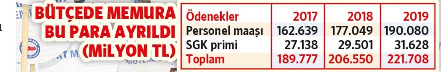Hükümet 2018 yılı memur maaş zammı için bütçeye sadece 177 milyar lira ödenek koydu. Ancak bu paranın 5.5 milyar lirası, bu yılki enflasyon farkına gitti. Yüzde 16.6 zam talebiyle pazarlık masasına oturan memura sadece yüzde 5.9 oranında zamma yetecek kadar para kaldı. Hükümetin Meclis’ten geçirdiği 2017, 2018 ve 2019 yıllarını kapsayan 3 yıllık bütçe kanunu, toplu sözleşme masasından yüksek zam çıkarmayı hedefleyen milyonlarca memur ve memur emeklisinin beklentilerini boşa çıkaracak rakamlar içeriyor. Hükümet başta memurlar olmak üzere tüm personel için bu yıl bütçeye, 162.6 milyar lirası maaş, 27.1 milyar lirası da SGK primi olmak üzere toplam 189.7 milyar lira ödenek koydu.2018 ZAMMI ZORA GİRDİ