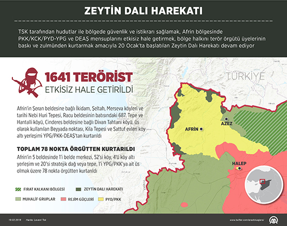 TSK tarafından hudutlar ile bölgede güvenlik ve istikrarı sağlamak, Afrin bölgesinde PKK/KCK/PYD-YPG ve DEAŞ mensuplarını etkisiz hale getirmek, bölge halkını terör örgütü üyelerinin baskı ve zulmünden kurtarmak amacıyla 20 Ocak'ta başlatılan Zeytin Dalı Harekatı devam ediyor. TSK ve operasyonlara destek veren ÖSO güçleri, harekatın başından bu yana YPG/PKK-DEAŞ'ın işgalindeki Afrin'in 5 beldesinde biri belde merkezi, 52'si köy, 4'ü köy altı yerleşim ve 20'si stratejik dağ veya tepe, biri YPG/PKK'ya ait üs olmak üzere 78 noktayı örgütten kurtarmış oldu.